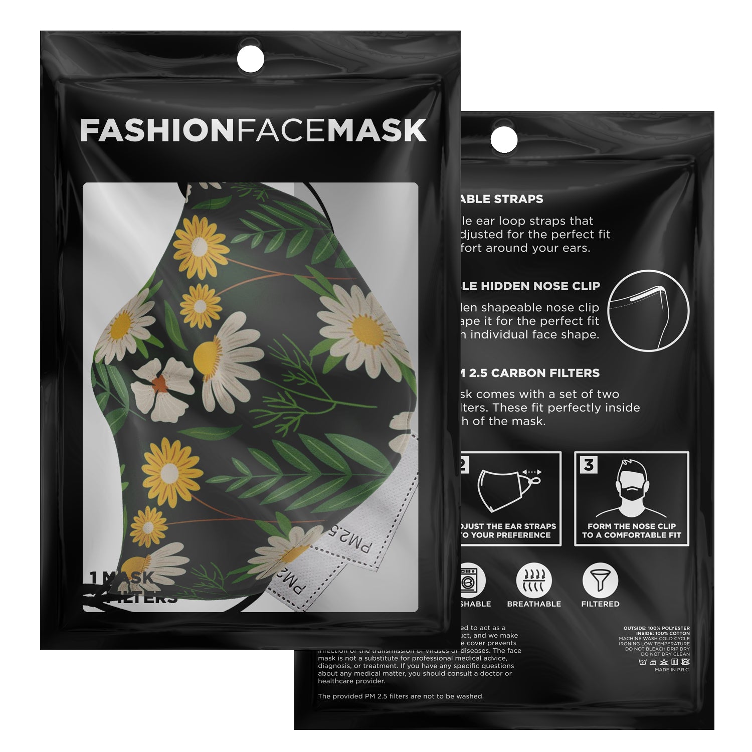 Look fashionable with this custom printed face mask. It comes with easily adjustable ear loop straps to fit all face shapes, as well as a shapeable hidden nose clip for that perfect fit. The outer surface is printed on a premium breathable polyester fabric that won't irritate your skin. While the inner surface is made from a soft breathable cotton fabric. On the inside of the face mask you can find a pouch where you can add any of your own filters. Each face mask also comes with 2 pieces of PM 2.5 filters that can be placed inside the pouch.