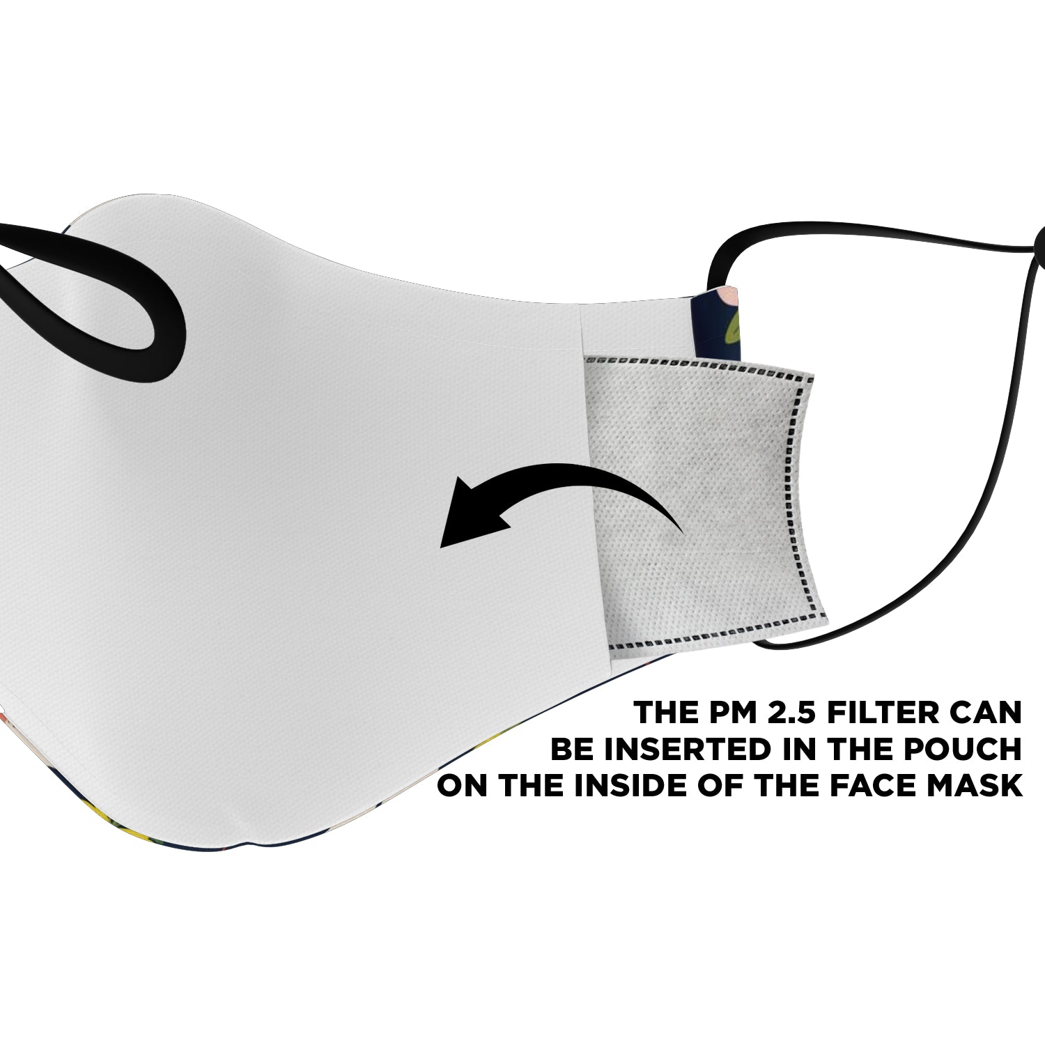 Look fashionable with this custom printed face mask. It comes with easily adjustable ear loop straps to fit all face shapes, as well as a shapeable hidden nose clip for that perfect fit. The outer surface is printed on a premium breathable polyester fabric that won't irritate your skin. While the inner surface is made from a soft breathable cotton fabric. On the inside of the face mask you can find a pouch where you can add any of your own filters. Each face mask also comes with 2 pieces of PM 2.5 filters that can be placed inside the pouch.