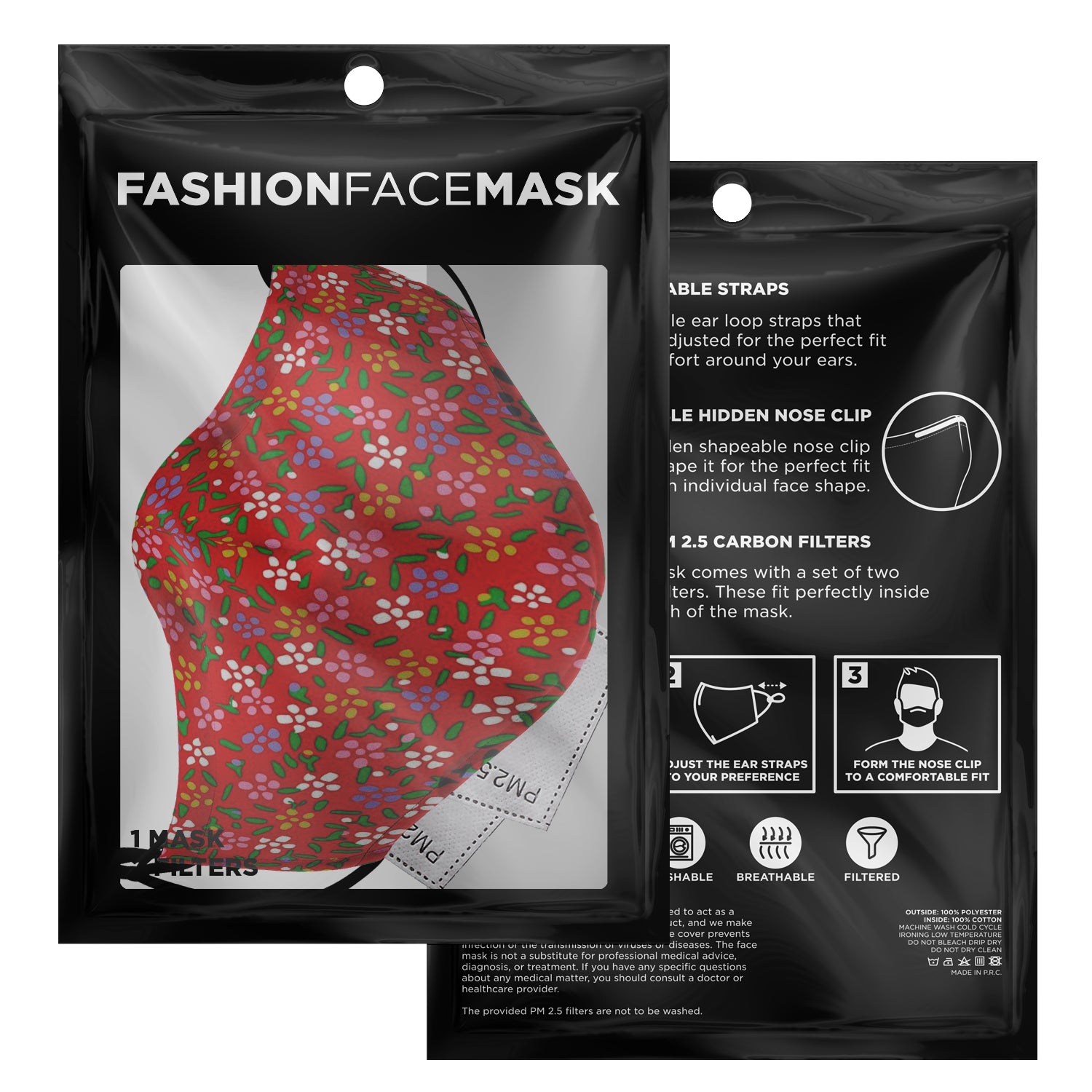 Look fashionable with this custom printed face mask. It comes with easily adjustable ear loop straps to fit all face shapes, as well as a shapeable hidden nose clip for that perfect fit. The outer surface is printed on a premium breathable polyester fabric that won't irritate your skin. While the inner surface is made from a soft breathable cotton fabric. On the inside of the face mask you can find a pouch where you can add any of your own filters. Each face mask also comes with 2 pieces of PM 2.5 filters that can be placed inside the pouch.