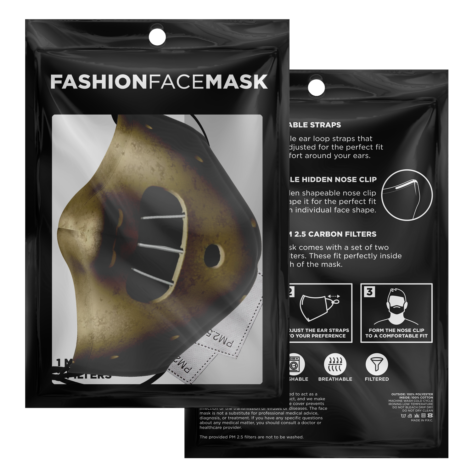 Look fashionable with this custom printed face mask. It comes with easily adjustable ear loop straps to fit all face shapes, as well as a shapeable hidden nose clip for that perfect fit. The outer surface is printed on a premium breathable polyester fabric that won't irritate your skin. While the inner surface is made from a soft breathable cotton fabric. On the inside of the face mask you can find a pouch where you can add any of your own filters. Each face mask also comes with 2 pieces of PM 2.5 filters that can be placed inside the pouch.
