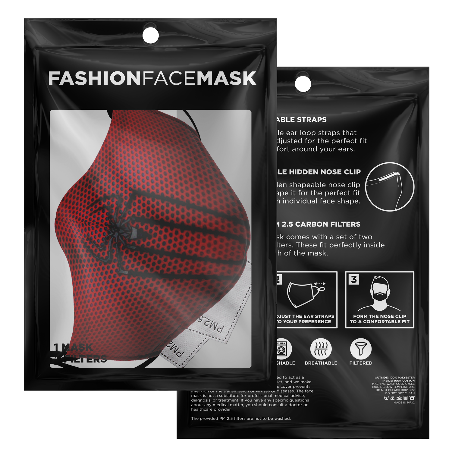 Look fashionable with this custom printed face mask. It comes with easily adjustable ear loop straps to fit all face shapes, as well as a shapeable hidden nose clip for that perfect fit. The outer surface is printed on a premium breathable polyester fabric that won't irritate your skin. While the inner surface is made from a soft breathable cotton fabric. On the inside of the face mask you can find a pouch where you can add any of your own filters. Each face mask also comes with 2 pieces of PM 2.5 filters that can be placed inside the pouch.